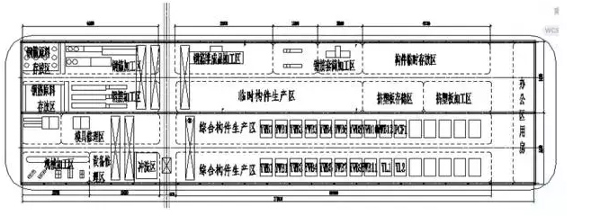 該項(xiàng)目生產(chǎn)工藝的選擇主要根據(jù)外墻板采用瓷磚反打一次工藝,且大多數(shù)外墻板為轉(zhuǎn)角型外墻板,不易在流水線上施工,所以選擇西車間固定模臺(tái)施工。車間劃分區(qū)為外墻板、PCF板及樓梯生產(chǎn)作業(yè)區(qū),擠塑板存儲(chǔ)區(qū)和加工區(qū),鋼筋與鋼筋套筒直螺紋連接加工區(qū),構(gòu)件沖洗區(qū)等。為滿足該項(xiàng)目生產(chǎn)發(fā)貨需要,將構(gòu)件存儲(chǔ)場地劃分為若干個(gè)區(qū)域,按照不同項(xiàng)目單獨(dú)存放預(yù)制構(gòu)件,此外,還在存儲(chǔ)場地劃分構(gòu)件修補(bǔ)區(qū)域,方便修補(bǔ)人員在該區(qū)域?qū)︻A(yù)制構(gòu)件進(jìn)行修補(bǔ),同時(shí)也將暫時(shí)需要修補(bǔ)的產(chǎn)品與合格產(chǎn)品進(jìn)行區(qū)分存放。