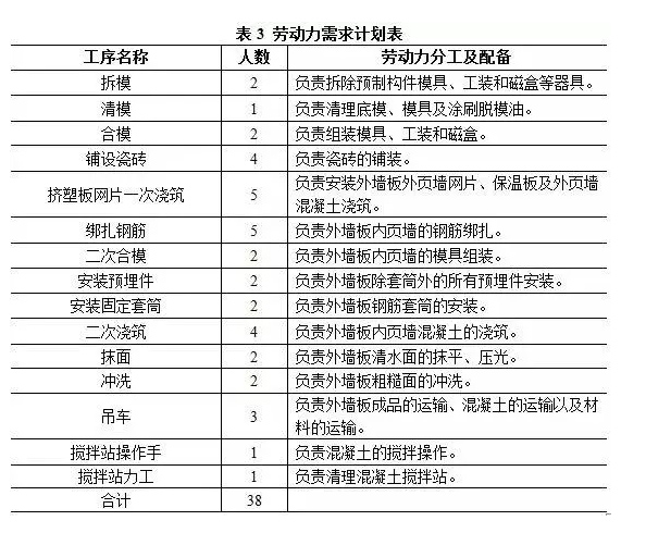 該項(xiàng)目施工前,組織相關(guān)人員對(duì)該項(xiàng)目預(yù)制轉(zhuǎn)角外墻板施工工藝、外墻板瓷磚反打一次成型工藝等施工階段的勞動(dòng)力消耗進(jìn)行實(shí)地考察和測算,并結(jié)合沈陽地方出臺(tái)的《裝配式建筑鋼筋混凝土預(yù)制構(gòu)件測算表》,同時(shí)考慮該項(xiàng)目的工藝技術(shù)要求、生產(chǎn)場地、生產(chǎn)周期、模具數(shù)量等因素,最后按照24分鐘的生產(chǎn)工藝節(jié)拍編制勞動(dòng)力需求計(jì)劃。(見表3)